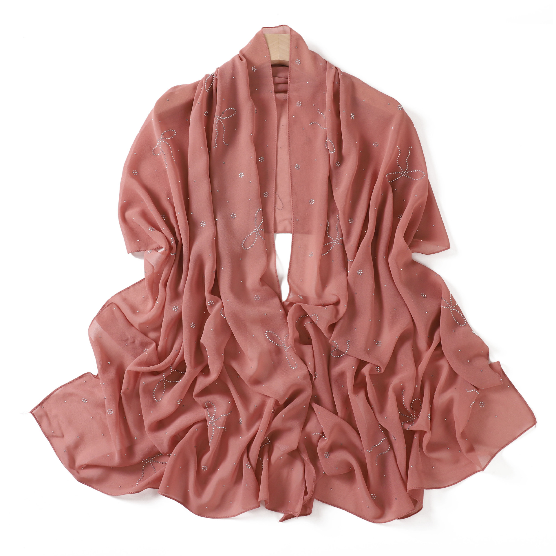 Embrace sophistication with Salaam-Fashion's Rose Pink Hijab, crafted from high-quality chiffon for a lightweight feel. The soft rose color, bow detail, and rhinestones add elegance and sparkle, perfect for prayer, gatherings, or pilgrimage—a stylish choice for yourself or as a gift.